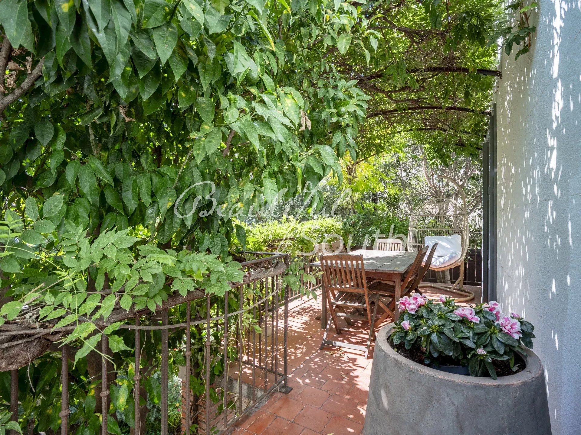 Upon entering, a discreet gate opens onto a magnificent south-facing landscaped garden—a true haven of peace in the city. A period staircase, lined with a wrap-around balcony and a shaded terrace covered in vibrant wisteria, leads to a beautiful custom-made wrought-iron veranda that serves as the main entrance.